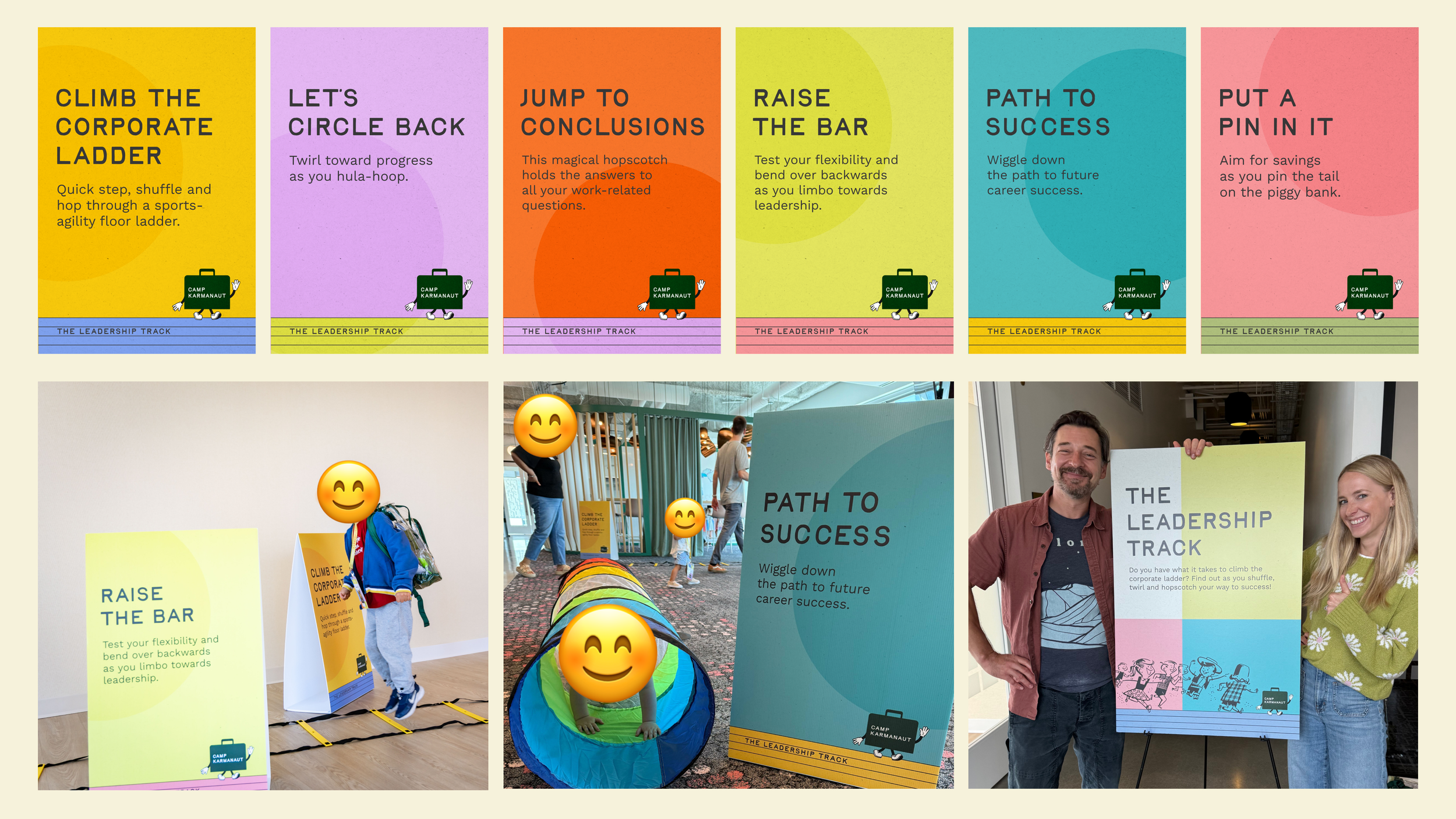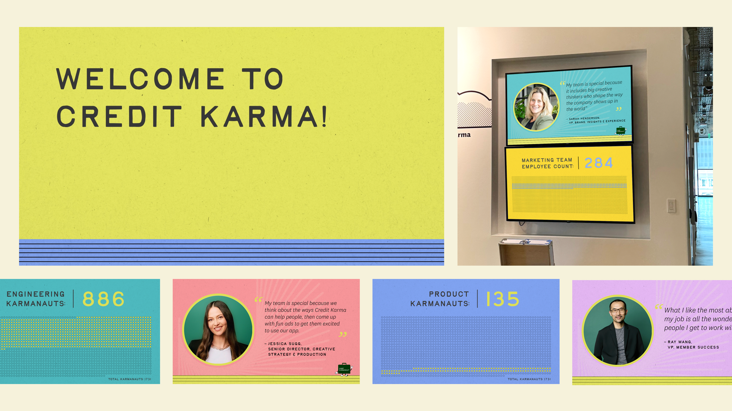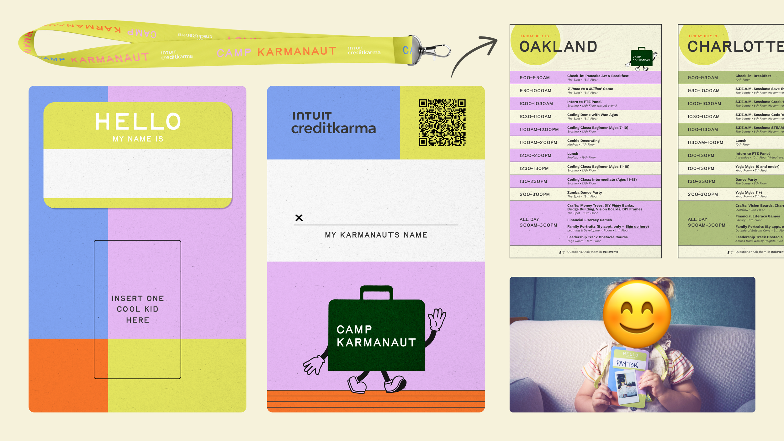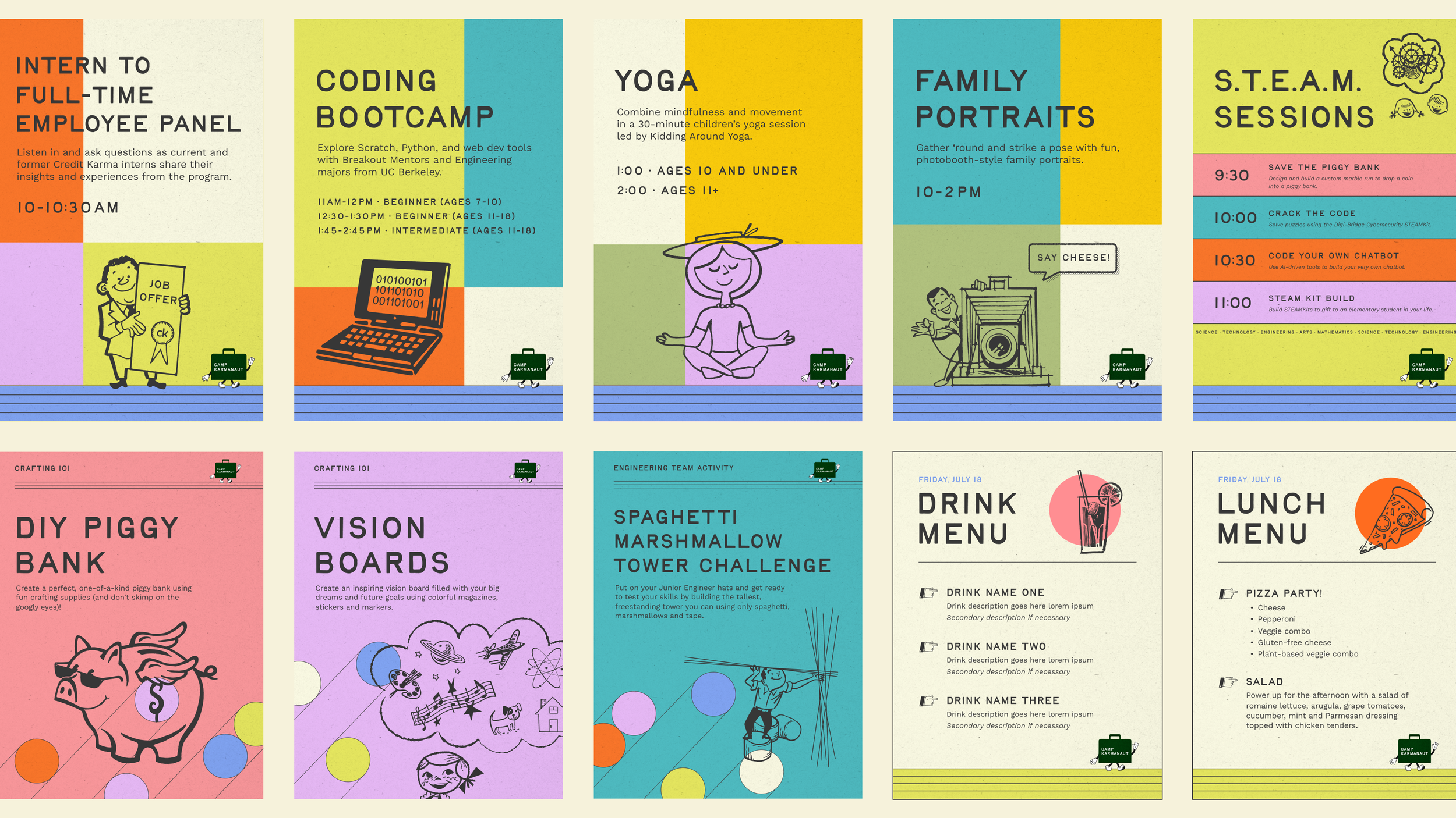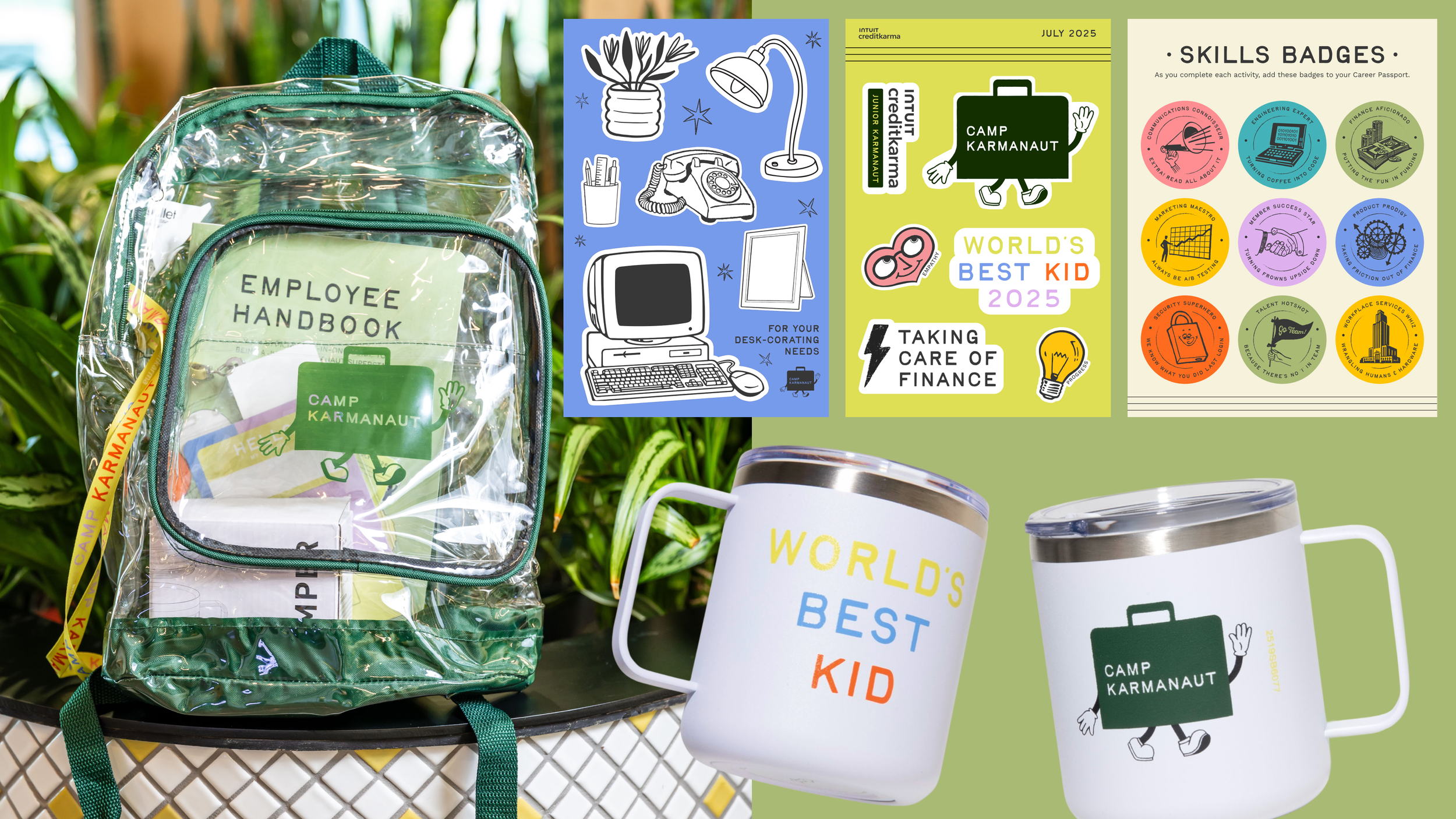 It’s everyone’s favorite event of the year – Camp Karmanaut! We created the branding for the event and designed all of the swag, produced the digital and print signage, and concepted kid-friendly activities alongside the Events Team. We were able to step outside of the Credit Karma design system for this company event, and focused the theme around a vintage 1950’s employee onboarding experience.